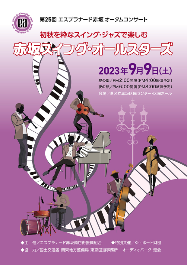 休日の赤坂に活気を!との思いから1996年にはじまったオータムコンサート。毎年※9月の土曜日に「エスプラナード赤坂 オータムコンサート」として開催しています。出演は、日本のジャズ界を代表するプレイヤーで、港区や赤坂に縁の深いメンバーで構成される「赤坂スイング・オールスターズ」。往年のジャズの名ナンバーが演奏されると、観客席は大いに盛り上がります。このコンサートはチケットが完売してしまうこともあるほどの人気です。