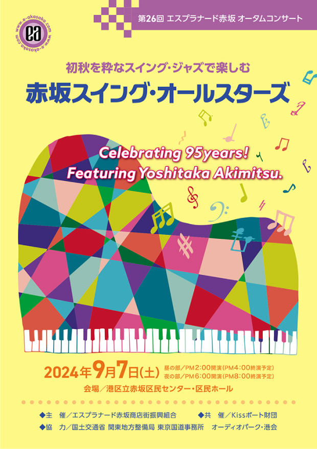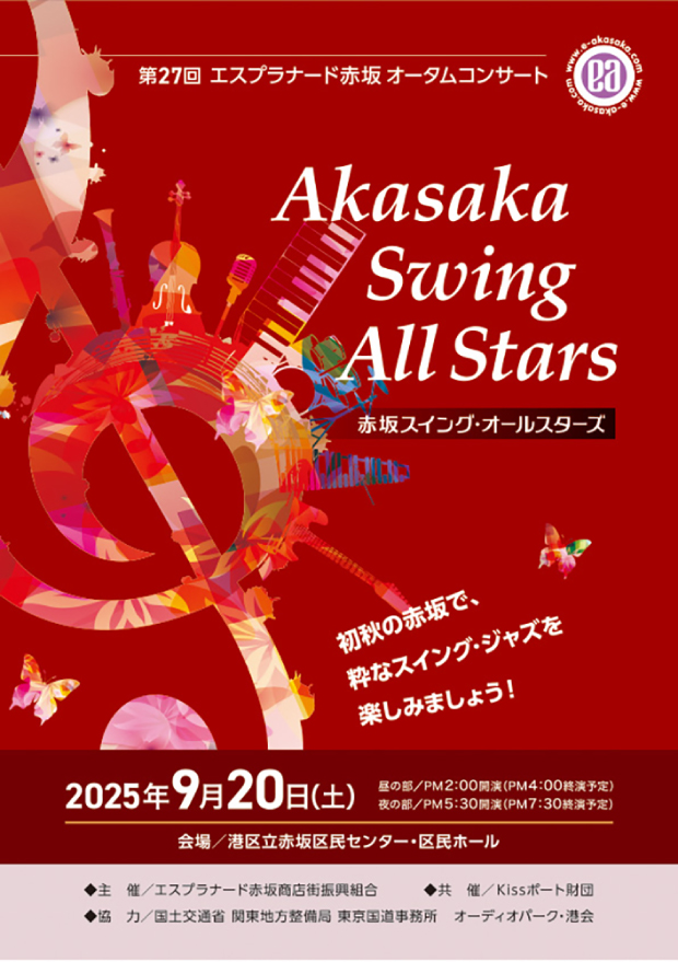 休日の赤坂に活気を!との思いから1996年にはじまったオータムコンサート。毎年※9月の土曜日に「エスプラナード赤坂 オータムコンサート」として開催しています。出演は、日本のジャズ界を代表するプレイヤーで、港区や赤坂に縁の深いメンバーで構成される「赤坂スイング・オールスターズ」。往年のジャズの名ナンバーが演奏されると、観客席は大いに盛り上がります。このコンサートはチケットが完売してしまうこともあるほどの人気です。