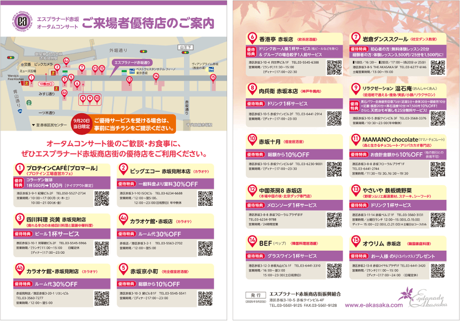 土曜日に営業をしている会員店舗に協力をいただいて、オータムコンサートご来場者様のために、当日限定で様々な優待サービスを実施しています。コンサート終わりのご歓談やお食事に、ご活用いただいています。